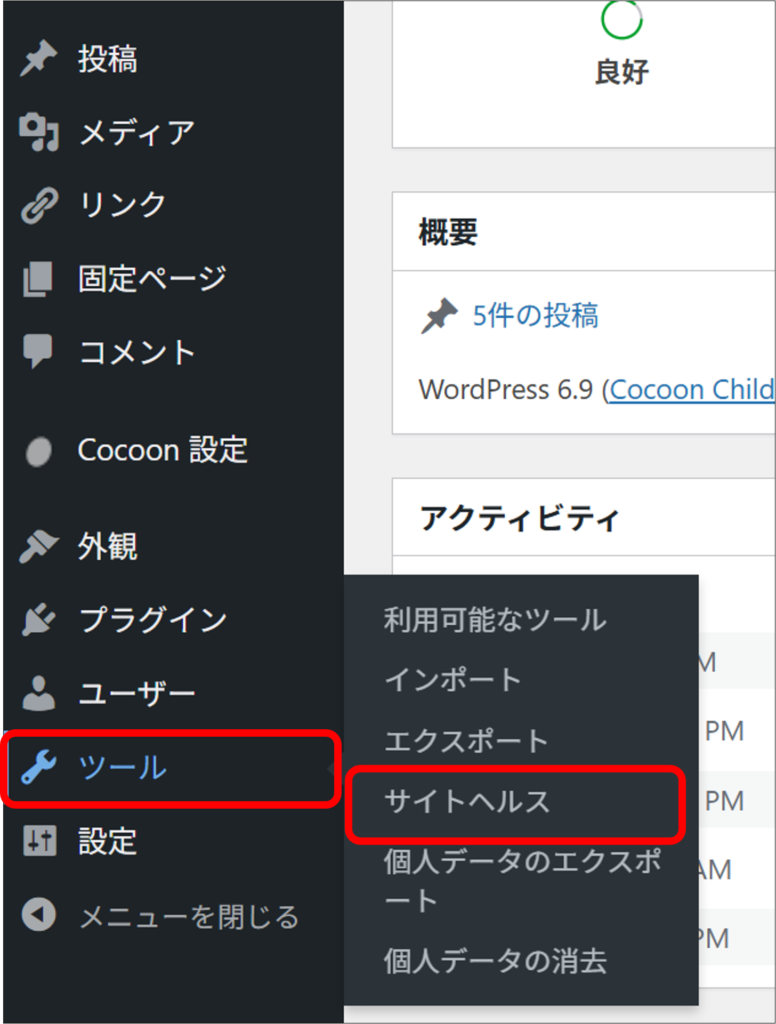 管理メニューの「ツール」から「サイトヘルス」を選択。